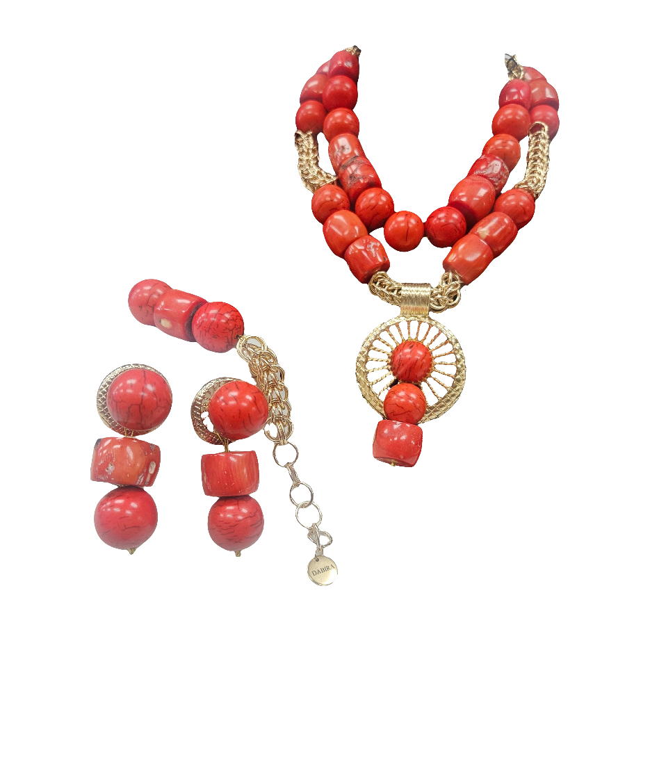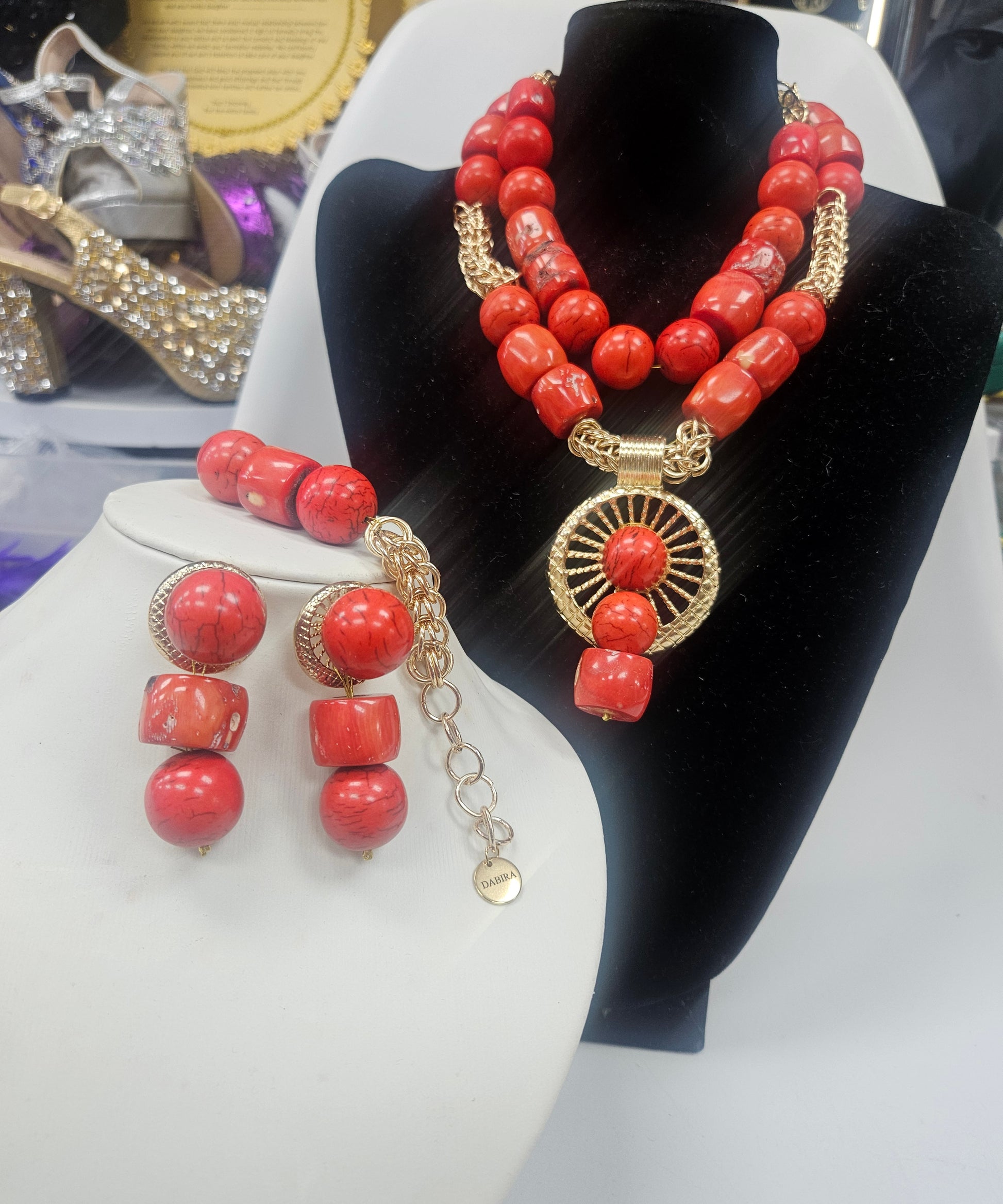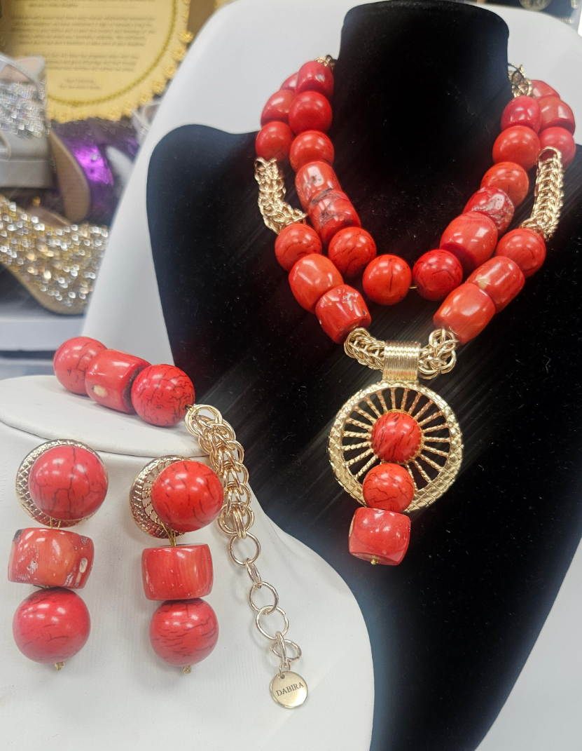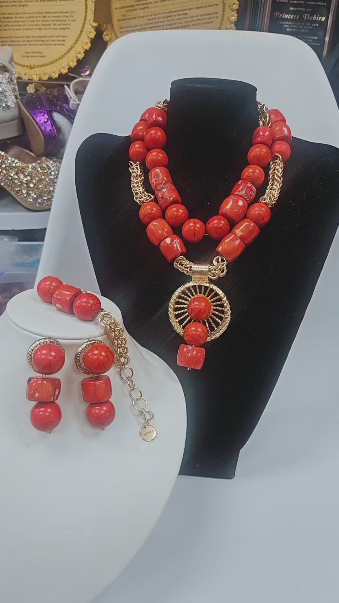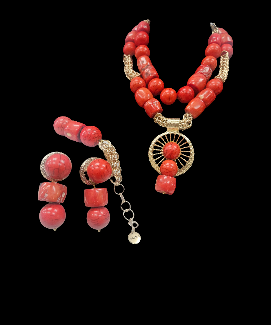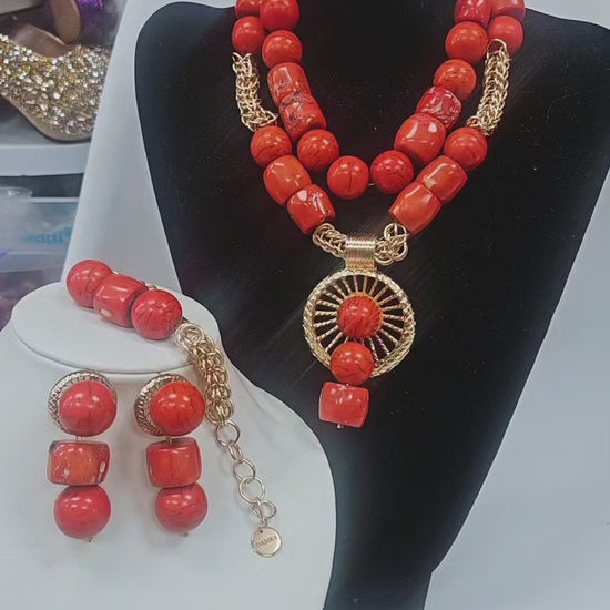 3 piece coral beads with 18 carat gold plated Brazilian gold. Has extention. Necklace Can fit sizes 18 to 24 inches. Bracelet fits size 7 to 10 inches